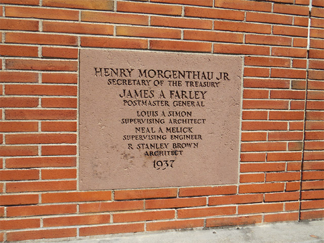 This photo from February 1939 gives you a taste of the Deco ornamentation that encompassed the entire building. You can also see a then-newly-planted tree and numerous additional ornamentation details (above and below the windows, and along the roof line) on the post office exterior that have since been removed. The large tiles have also been replaced with brick.