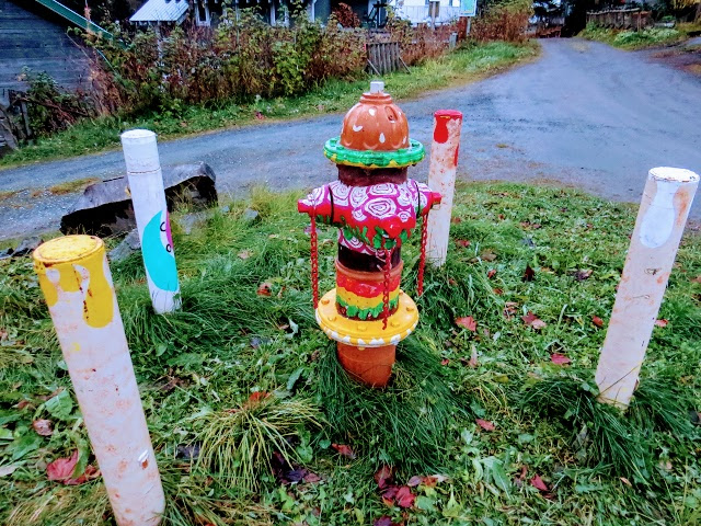 From my brief time in Seldovia... 1) A really nice decorated fire hydrant; 2) Flower pot/shoes at a house on the boardwalk; 3) The boardwalk; 4) Stained glass window at the Seldovia Village Tribe Visitor Center.